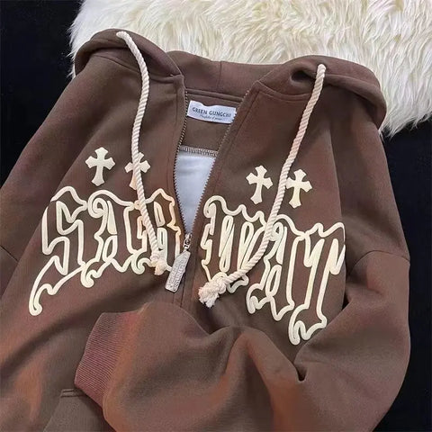 Get dressed in fashion with our Casual Sweatshirt Fashion Hoodie. This modern hoodie comes with Goth Embroidery and offers a vibrant, stand-out style. Look no further for the perfect high street Harajuku look, making you the center of attention wherever you go. The Y2K Zip Up Hoodie is made from high-quality materials, and its retro hip hop design ensures maximum comfort. Whether worn as casual wear or to complete a smashing outfit, this Korean fashion hoodie has got you covered! You'll love the loose fit and contemporary look this piece offers. Make heads turn every time you wear your new Casual Sweatshirt Fashion Hoodie!