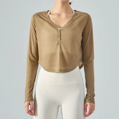 Elevate your active wardrobe with our Slim V-neck Long Sleeve Yoga Top – a versatile and stylish addition to your fitness attire. Designed for women who value both fashion and functionality, this long-sleeve sports shirt is perfect for various activities, from gym workouts to outdoor runs. The slim V-neck design offers a flattering neckline while allowing easy movement during exercises. Its loose fit provides comfort and breathability, making it an ideal choice for fitness enthusiasts. Crafted from quick-drying fabric, this training blouse ensures that you stay comfortable and dry even during intense workouts. It's perfect for those who prioritize convenience and style in their activewear. Whether you're hitting the gym or enjoying an outdoor run, our Slim V-neck Long Sleeve Yoga Top is the perfect choice to keep you looking and feeling great while you work on your fitness goals.